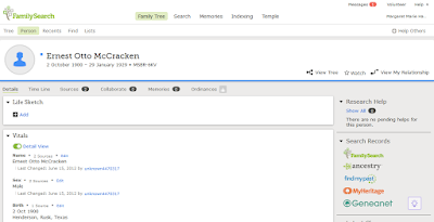Today, I added a record (historic document record) to the profile of Ernest Otto McCracken at FamilySearch.org.